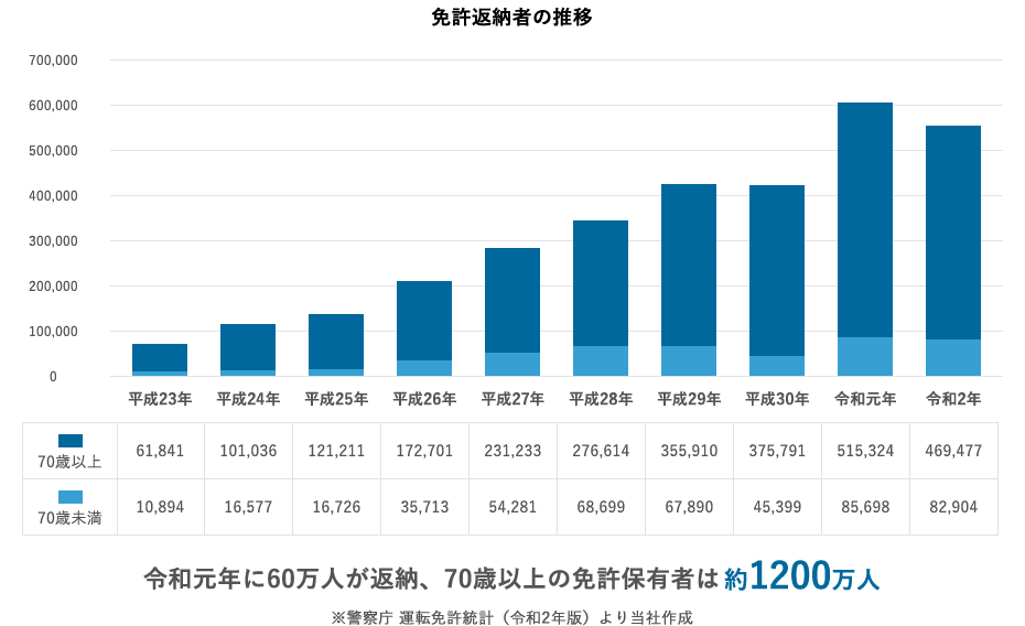 平成23年以降の免許返納者は増加傾向にあり、令和元年の免許返納者は約60万人でそのうち50万人以上が70歳以上の高齢者となっています。また、内閣府の調査によると60歳以上の55.5%が外出に何らかの障害を感じており、高齢者ほど外出や移動に関してハードルが高い状態で有ることが確認されています。