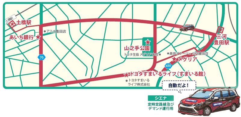 ・とよたおいでんバスのバス停からご乗車できます(予約不要)