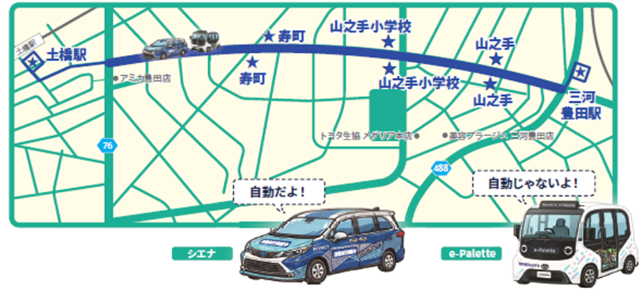 | 〇実証内容 | 定時定路線及びデマンド運行路線で自動走行車両(乗客:4人)が1台ずつ自動走行し、社会実装に向けた走行性能や事業性を検証するとともに、定時定路線で自動走行する車両を、手動運転の「e-Palette」(乗客:10人)が追従する形で走行し、今後e-Paletteが公道を自動運転することを見据えた、運行上のリスクなどを検証します。 |